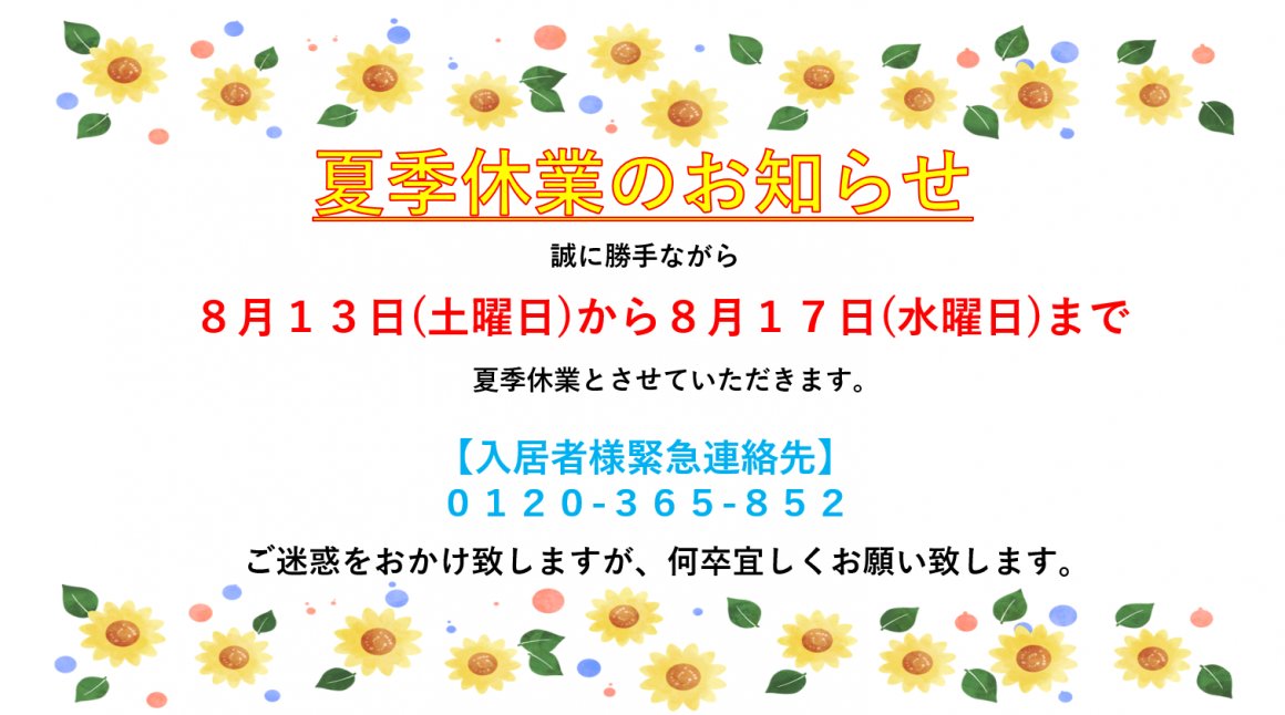 誠に勝手ながら8月13日(土)~ 8月17日(水)は夏季休業とさせていただきます。